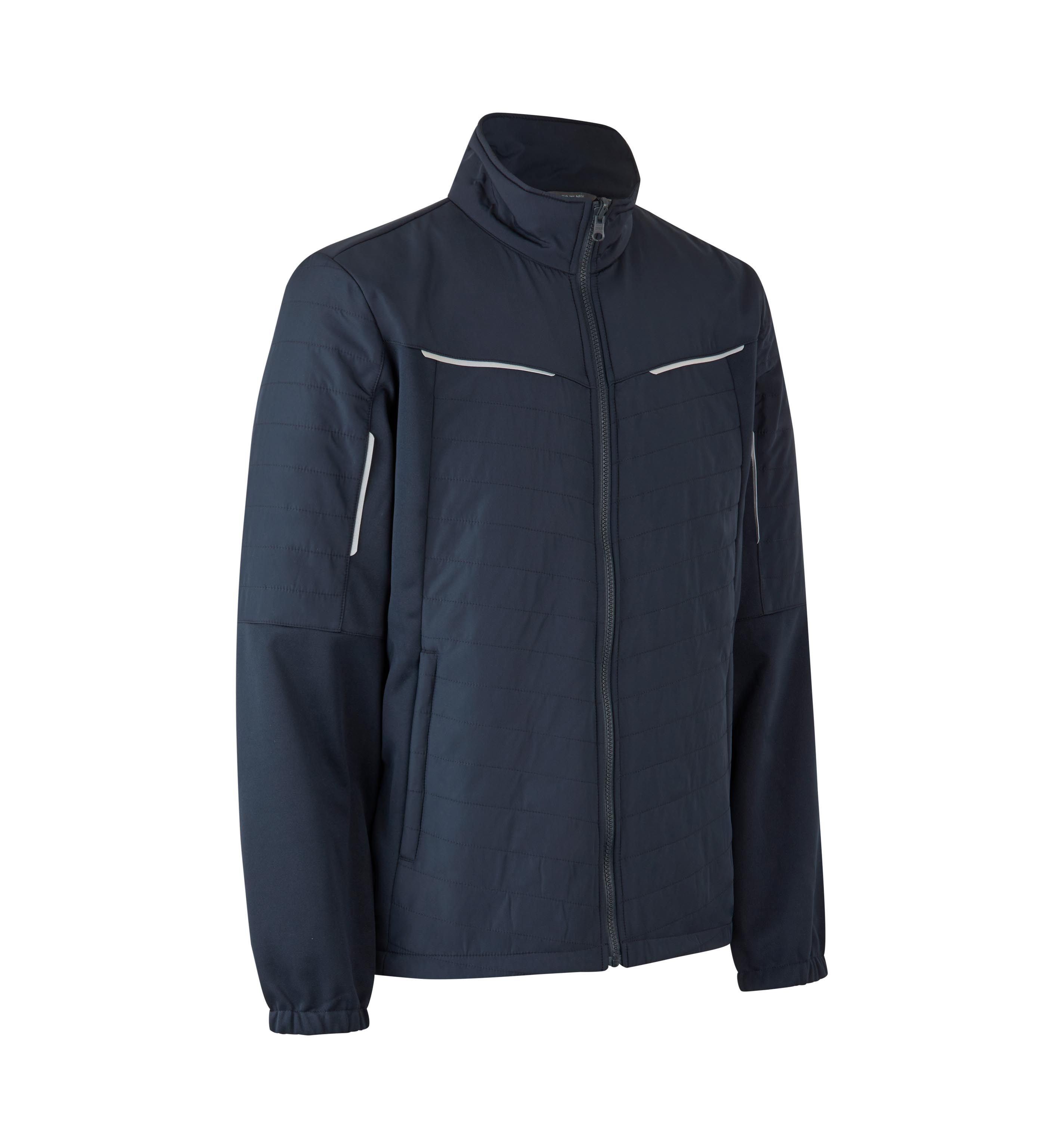 Strækbar og komfortabel hybridjakke i let vattering og synlige refleksbånde. Skjult sidelomme med YKK lynlås samt indvendig lomme. Hybridjakken fungerer som et ekstra isolerende lag, når den kombineres med Zip-n-Mix skaljakken (0712).