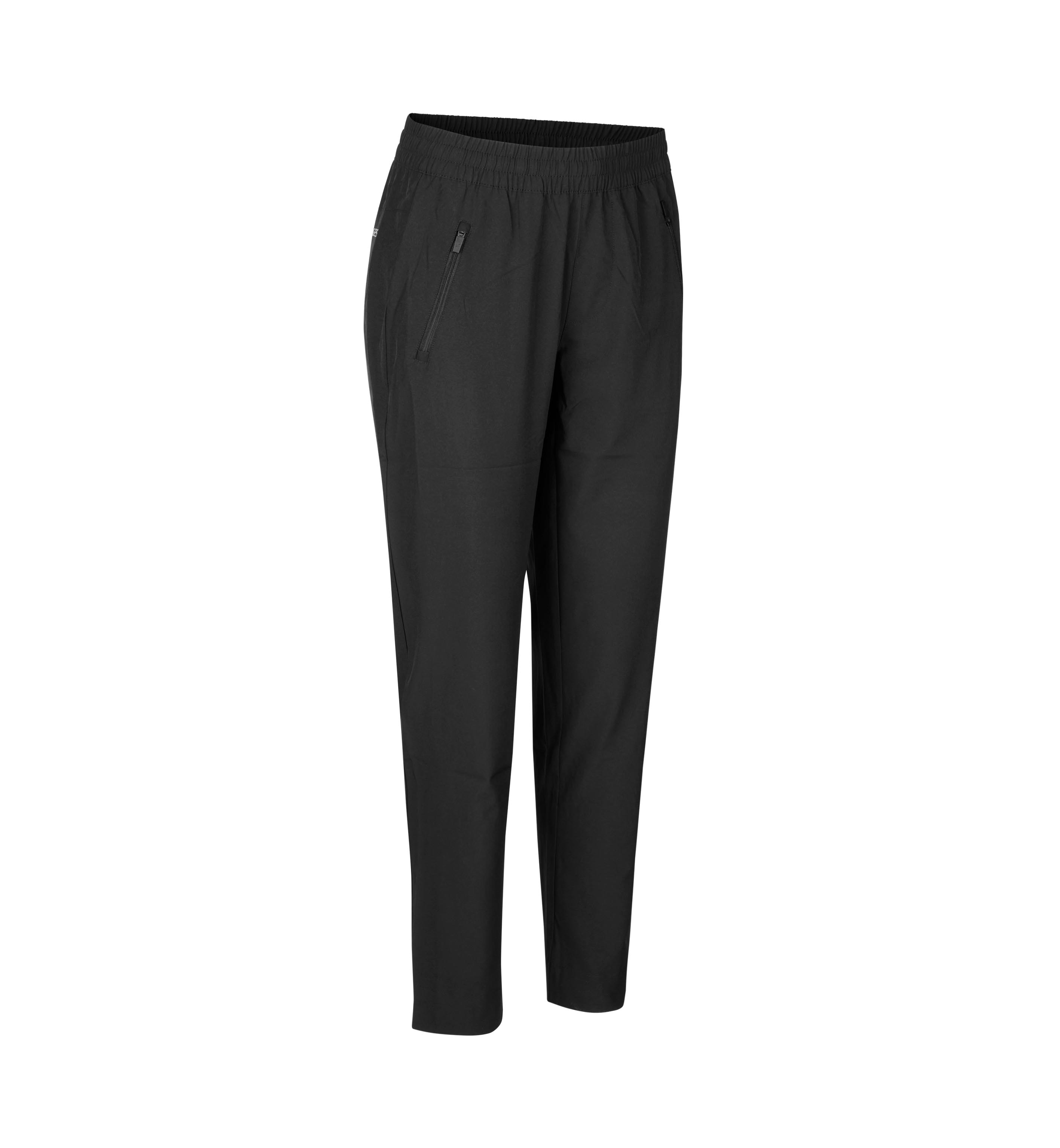 Buks til både arbejde og fritid. Komfortabel vævet stretch kvalitet, som ikke krøller. Elastik linning og indvendig snor regulering. To lynlås lommer i front og bærestykke bagpå for god pasform. Slank benvidde.