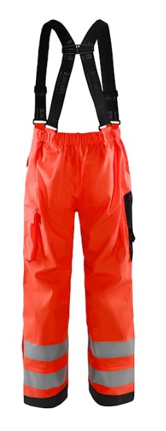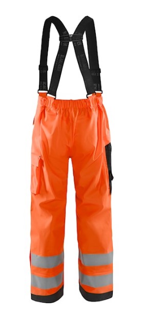 High Vis regnbukser til dig med arbejdsopgaver, der kræver slidstærkt og fleksibelt regntøj. Buksen er vind- og vandtæt med svejsede sømme. God pasform med bred elastik på bagsiden, justerbare og aftagelige elastik seler og justerbar benafslutning med knapper. Let tilgændelige kommer som lårlomme med læg og klap, tommestoklomme med ekstra lomme, knivlomme og åbning med klap for brug af sømlommer. Bukserne er forstærket på knæ og nederste del af bukseben. Certificeret i henhold til EN 343, beskyttelsesbeklædning mod dårligt vejr og EN ISO 20471, klasse 2, beskyttelsesbeklædning med høj synlighed.