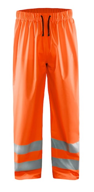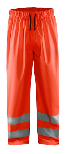 High Vis Regnbukser til dig med arbejdsopgaver, der kræver let og komfortabelt regntøj. Buksen er vind- og vandtæt med åndbarhed og svejsede sømme samt reflekser foran og bagpå. Den har en god pasform med elastisk talje og snøre i taljen samt justerbar benafslutning med knapper. Certificeret i henhold til EN 343, beskyttelsesbeklædning mod dårligt vejr og EN ISO 20471, Klasse 2, beskyttelsesbeklædning med høj synlighed.