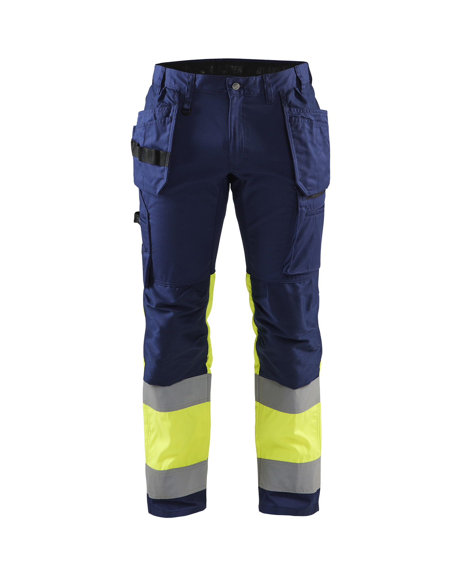 Lette og fleksible High Vis bukser i slidstærkt, men fleksibelt materiale, der er velegnede til krævende arbejdsmiljøer. Bukserne har særlig god bevægelsesfrihed på grund af stretch panelerne i skridtet, knæ og bagdelen. Forstærket knælommer i CORDURA® stretch materiale for større komfort, når du arbejder på knæ. Bukserne har flere funktionelle lommer og veldesignede detaljer, som udnyttes optimalt på denne model. Indvendig telefonlomme, tre-sektions sømlommer og tommestoklomme med knivholder og blyantlomme. Certificeret i henhold til EN ISO 20471 Klasse 1, beskyttelsesbeklædning med høj synlighed.