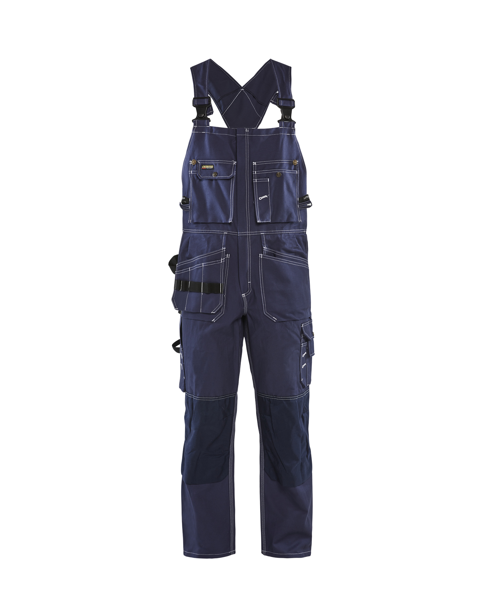To løse brystlommer med sikkerhedsstropper, en med klap og en med blyantlomme. To løse sømlommer, der kan sættes i de forreste lommer. Lårlomme med klap, blyantlomme og telefonlomme. Knælommer i CORDURA®. Tommestok lomme og ekstra lomme. Hammerholder. To baglommer med læg. Kraftig lynlås i metal. Ekstra stærke seler med spænder. Mejselommer på sømlommer, D-ring til fastgørelse af ID-kortholder 2130. Certificeret i henhold til EN14404-standard sammen med EN14404-certificerede knæpuder, model: 4000, 4008 og 4018.