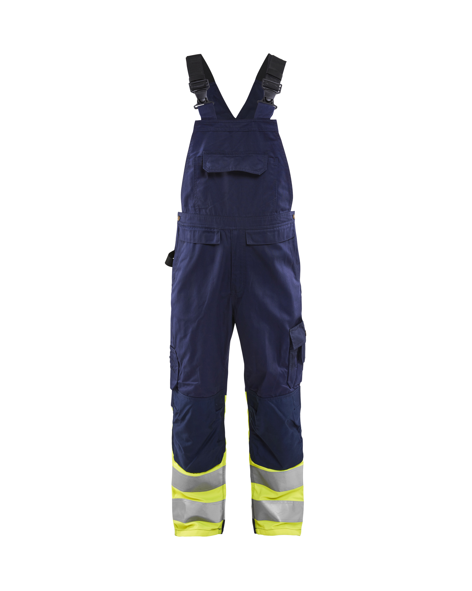 High vis overall med reflekterende detaljer på bagsiden. Bukserne har CORDURA® knælommer, samt CORDURA®-forstærkede baglommer og tommestoklomme. Aftagelige sømlommer 2183, som sælges separat, kan let monteres. De formsyede ben giver større komfort og de kan justeres i taljen. Certificeret i henhold til EN ISO 20471 Klasse 1. Samcertificeringsgruppe W.