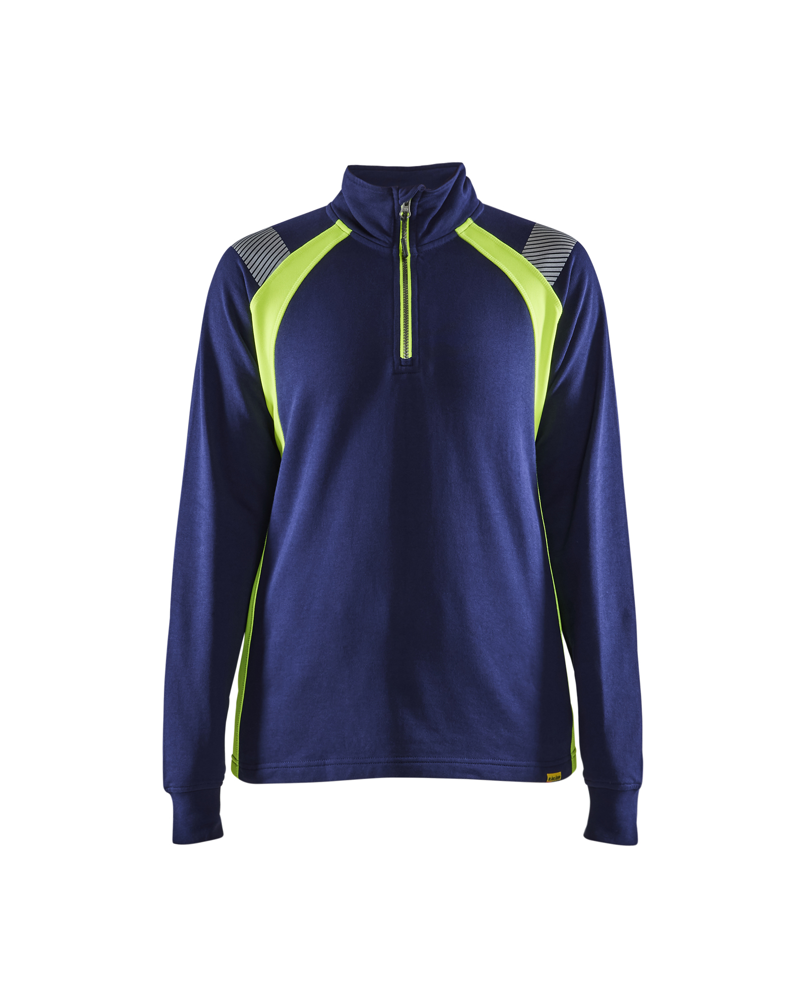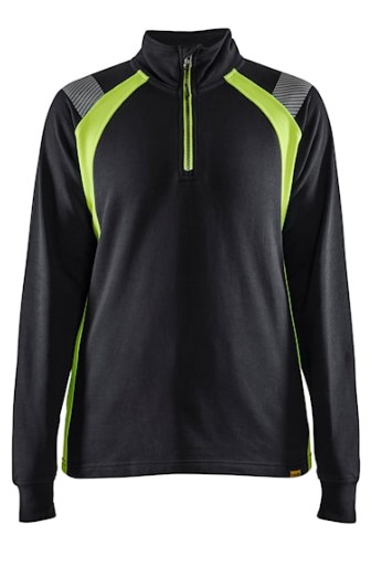 Sweatshirt i damemodel, der tilhører visible kollektionen, har kort lynlås foran, ribkant i ærmeafslutningen og en forlænget ryg. Den har fleksible reflekser og paneler i high vis for øget synlighed. De mørke områder på sweatshirten er 100% bomuld og high vis områderne er 100% polyester. Baseret på herremodel 3432.