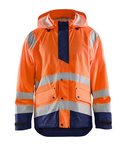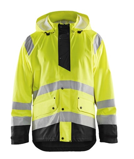 Denne lette High Vis regnjakke giver dig høj synlighed på arbejdspladsen, når vådt vejr og dårlig sigtbarhed kan gøre arbejdsforholdene vanskelige. Materialet er slidstærkt, selv om det er let, vind- og vandtæt og med svejsede sømme. Jakken har en længere ryg og justerbar kant med lette forlommer med flap og ærmer med velcro. Certificeret i henhold til EN 343, beskyttelsestøj mod dårligt vejr og EN ISO 20471, klasse 3, beskyttelsesbeklædning med høj synlighed.