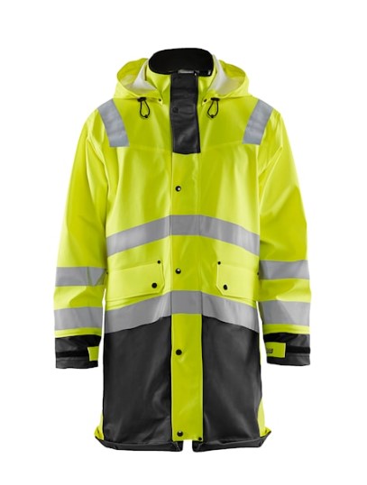 High Vis Regnjakke til dig med arbejdsopgaver, der kræver ekstrem slidstærkt regntøj. Det er vind- og vandtæt med svejsede sømme. Jakken har aftagelig justerbar hætte, blød fleeceforet krave og har let tilgængelige lommer som f.eks. aftagelig ID-kortlomme, lommer med klap og trykknap samt indvendig napoelonslomme. Skjult kraftig tovejs lynlås op til kraven, trykknapper foran og stormklap, der holder vandet ude. God pasform med justerbar ærmer med velcro og indvendig neopren manchet, der holder kropstemperaturen selv når det er vådt. Jakken har en opknappelig drypkant. Certificeret i henhold til EN 343, beskyttelsesbeklædning mod dårligt vejr og EN ISO 20471, klasse 3, beskyttelsesbeklædning med høj synlighed.