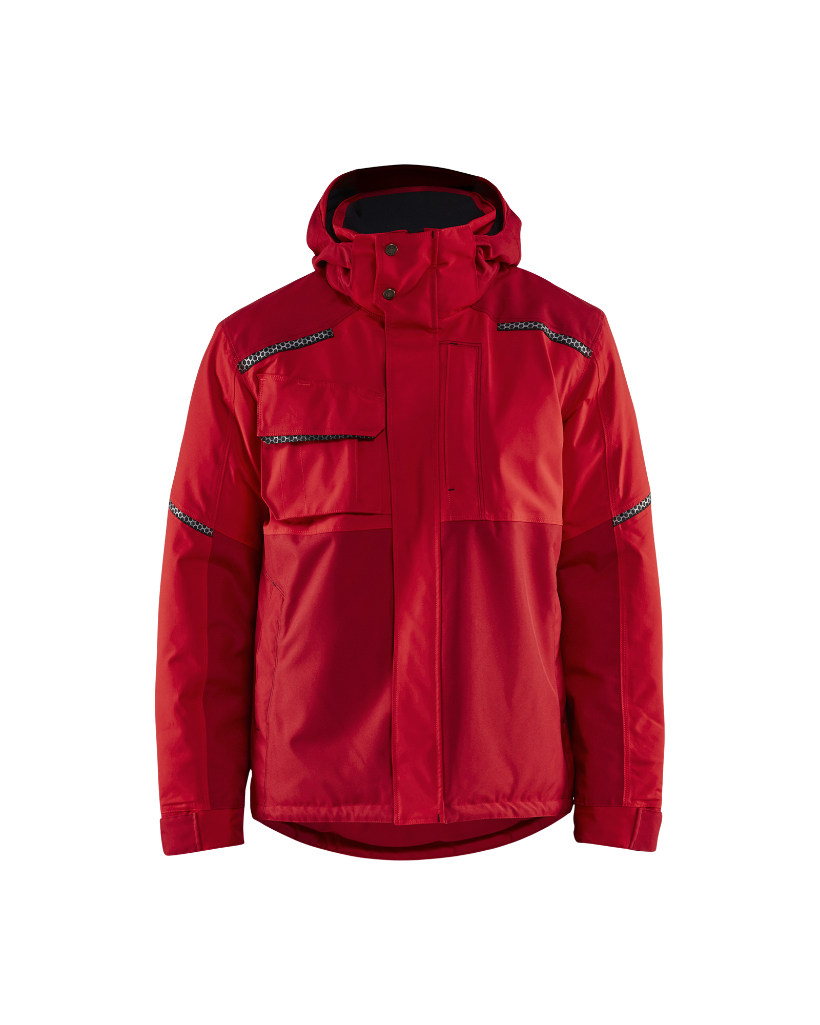 Funktionel vind- og vandtæt vinterjakke med tapede sømme, fleece foret krave og aftagelig hætte, der er justerbar. Den har mesh for på de store sved zoner for at transportere fugt væk fra kroppen. Jakken er udstyret med en række lommer, såsom brystlomme til kuglepenne eller mobiltelefon, inderlomme og forlommer med lynlås og indvendig fleece. Refleksdetaljer på front, ryg, hætte og ærmer. Ærmeafslutningen kan justeres med velcro og har tommelfingerhul. Perfekt til at bære under de kolde vinterdage. Certificeret i henhold til EN 342 beklædning til beskyttelse mod kulde med vinterbuks model 1810 og EN 343 beklædning mod dårligt vejr. Findes også i damemodel 4971.