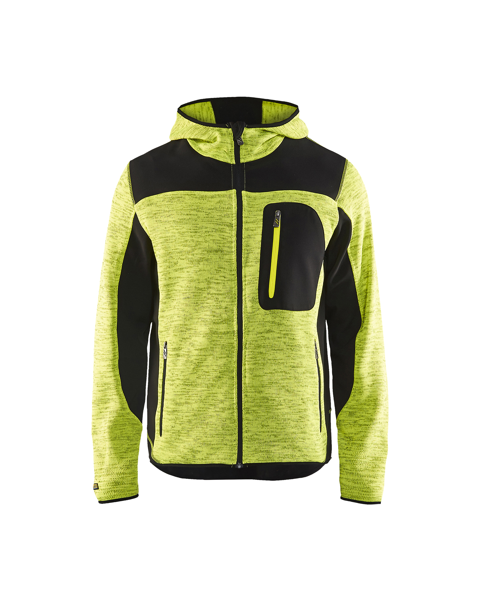 Strikket jakke med hætte i smart design og komfortabelt materiale med børstet inderside. Jakken har lynlås i kontrastfarve, og er forstærket med slidstærk softshell-materiale på albuer, skuldre og nederst på ryggen. Denne jakke er velegnet til både fritid og arbejde. Findes også i damemodel 4931.
