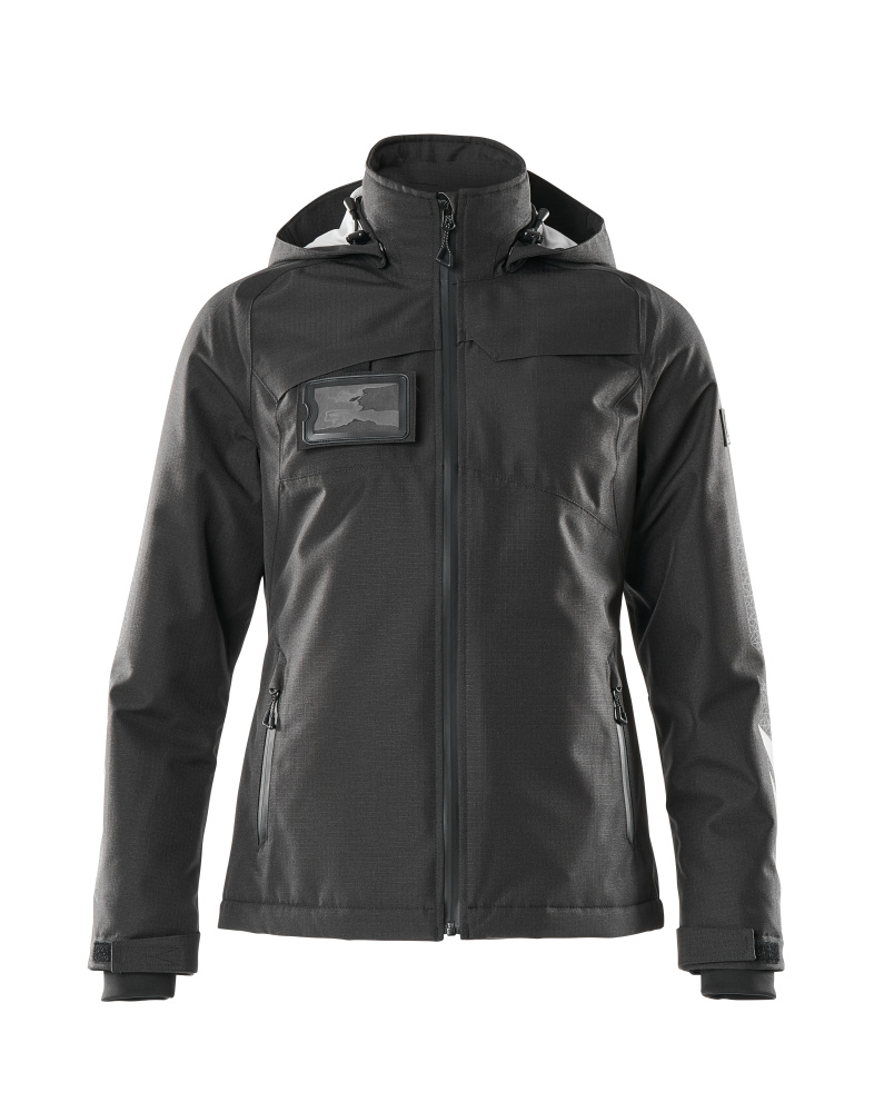 Damepasform. Åndbar, vind- og vandtæt. Sømme er tapede. Med CLIMASCOT® Lightweight Insulation. Hætten er aftagelig, foret og har regulerbar elastiksnøre. Lukning med lynlås og vindfang. Inderlomme med lynlås. ID-kortholder er aftagelig. Forlommer med lynlås. Elastiksnøre i nedre kant er regulerbar. Lynlås nederst på ryg indvendigt anvendes ved tryk/broderi på produktet. Ærmer med CORDURA®-forstærkninger. Rib (skjult i vindfang) ved håndled. Print og reflekseffekter.