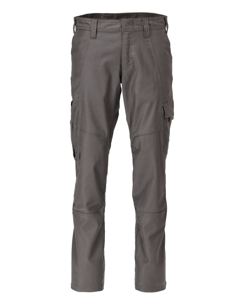 Tonålssømme på ben og i skridt. Lav talje. Bæltestropper. D-ring. Knaplukning er skjult. Gylp med lynlås. Bukseben er ergonomisk formede. Forlommer. Baglommer. Lårlomme med telefonlomme og klap med skjulte trykknapper. Tommestoklomme er forstærket og med lille lomme uden på.