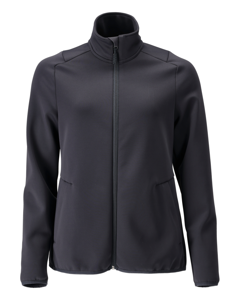 Damepasform. Lukning med lynlås. Forlommer. Inderlommer. Elastikbånd ved håndled og i nedre kant.