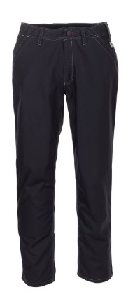 Tonålssømme og trenålssømme på ben og i skridt. Lav talje og formskåret linning. Bukseben er ergonomisk formede. Bæltestropper. Gylp med lynlås. Forlommer. Baglommer, den ene med klap og lynlukning. Kontraster (røde) diskret fordelt på dele af produktet.
