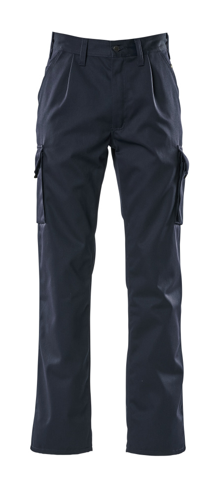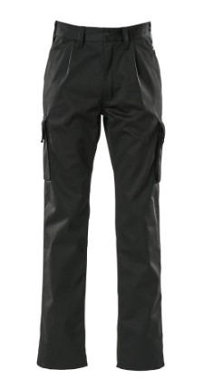 Trenålssømme på ben og i skridt. Bæltestropper. Gylp med lynlås. Forlommer. Billetlomme. Baglommer med forstærkninger, klap og lynlukning. Lårlommer, den ene med klap og lynlukning. Telefonlårlomme med klap og regulerbar lynlukning. Penlommer.